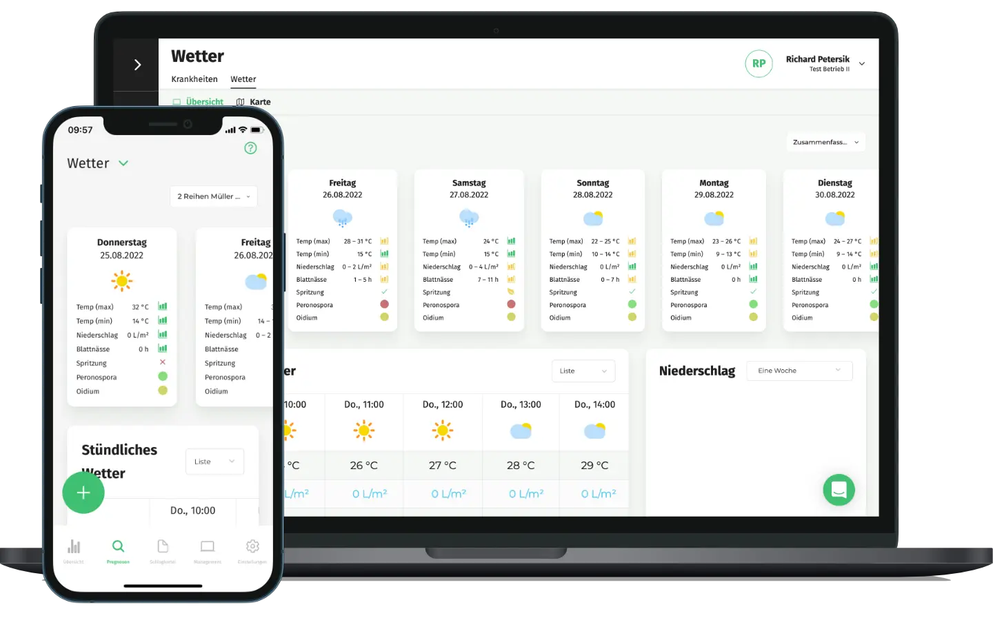 Für die Implementierung der Prognosen in Ihren Weinbergen sind keine Wetterstationen notwendig. Mithilfe der VineForecast Rebenschutz-App können Sie einfach am PC oder dem Smartphone Ihre Schläge anlegen und sofort alle Prognosen beziehen. Bleiben Sie so immer über eine Plattform auf dem aktuellen für Ihre gesamte Betriebsfläche auf dem aktuellsten Stand.